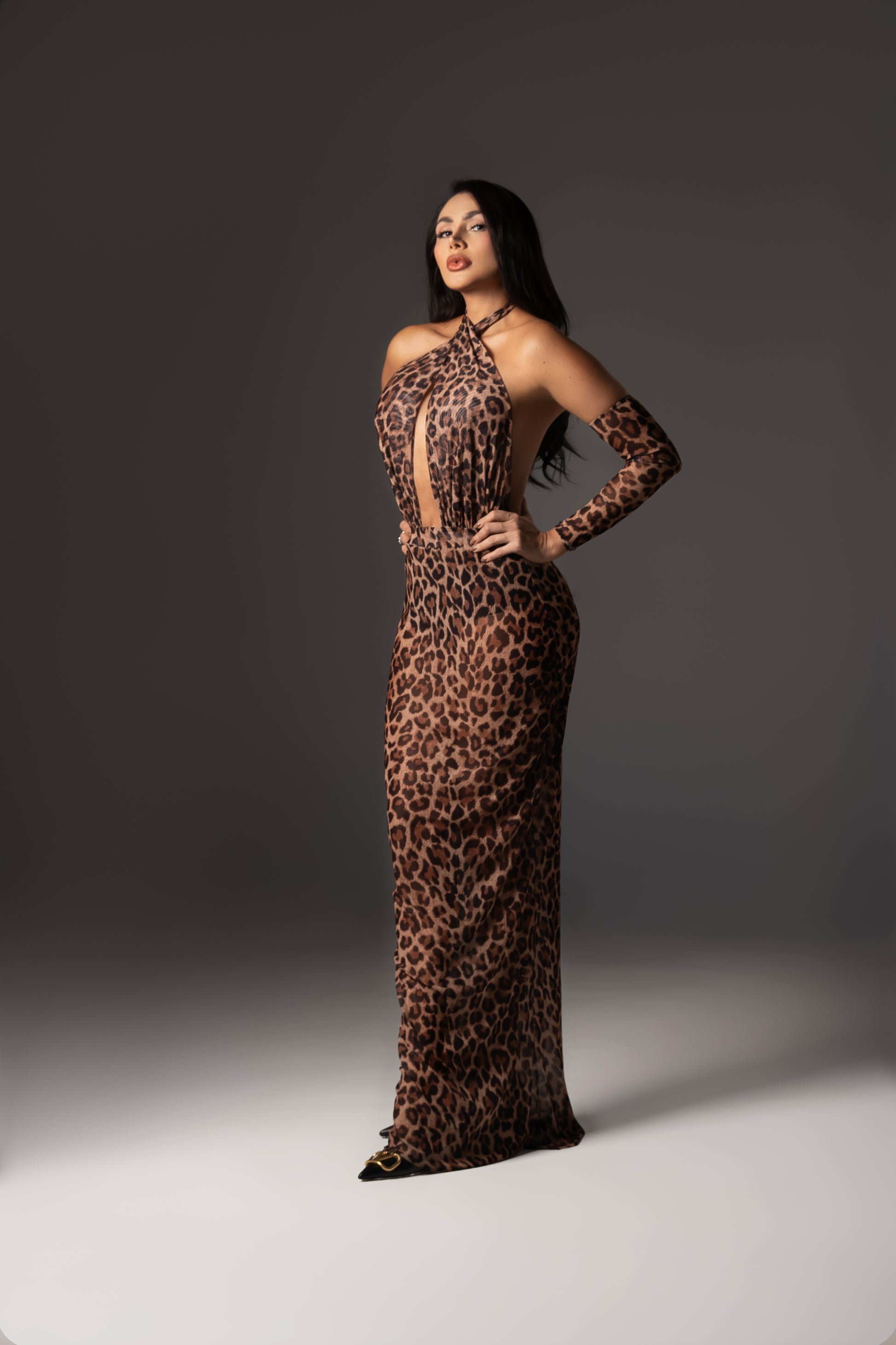 Un diseño que redefine la sensualidad desde la elegancia. El cuello alto aporta estructura y sofisticación al frente, mientras que la espalda descubierta revela una silueta poderosa y segura. Su falda en caída libre con transparencias sutiles genera un movimiento etéreo que captura miradas con cada paso.