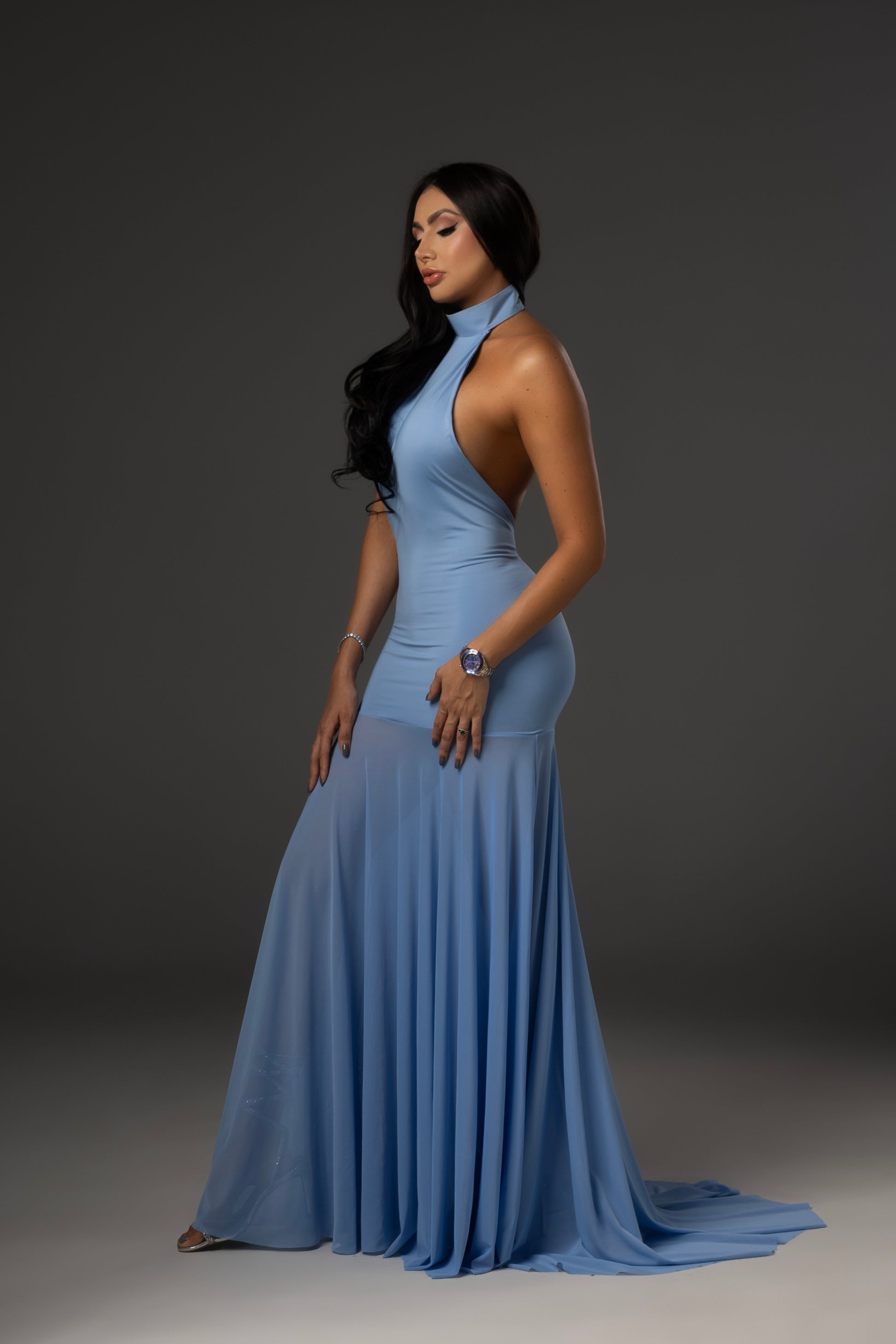 Un diseño que redefine la sensualidad desde la elegancia. El cuello alto aporta estructura y sofisticación al frente, mientras que la espalda descubierta revela una silueta poderosa y segura. Su falda en caída libre con transparencias sutiles genera un movimiento etéreo que captura miradas con cada paso.